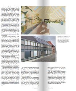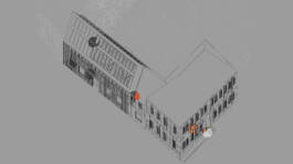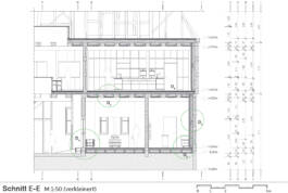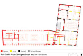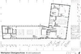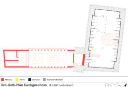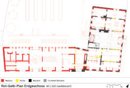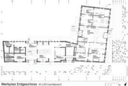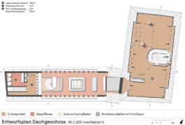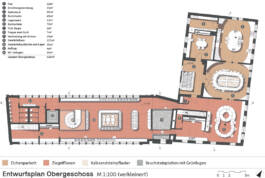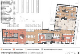 Von der Bäckerei aus gelangt man über Rampen in den flacher gelegenen Anbau, der zum luftoffenen Atrium über beide Etagen wird und Alt- mit Neubau verbindet. Dort befindet sich das Restaurant samt offener Küche, sowie ein weiterer Eingang mit Korridor, der in seinen Dimensionen dem des Bestands ähnelt und durch eine auffällige Wendeltreppe ebenso Erd- und Obergeschoss verbindet. Richtung Nachbargebäude befinden sich mit einem barrierefreien WC, einem Lager mit Kühlraum, dem Hausanschlussraum sowie einer Umkleide für Mitarbeitende eher weniger öffentliche, aber zweckorientierte Räume.