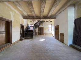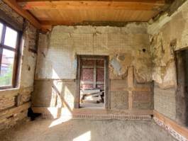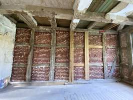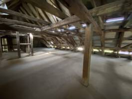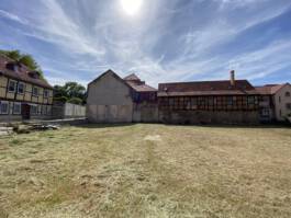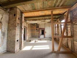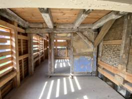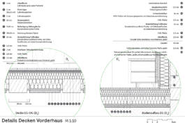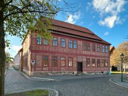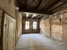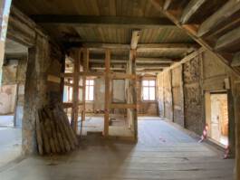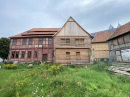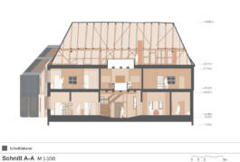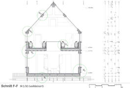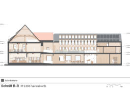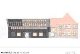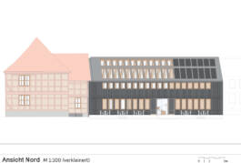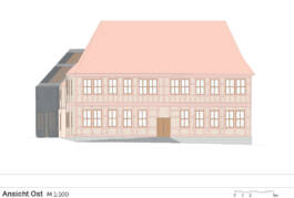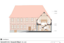 Aus dem über 300 Jahre alten Fachwerkhaus wird das Haus der gesunden Ernährung, welches auch die Baulücke des ehemaligen Seitenflügels füllt. Dort entsteht ein Neubau, der in Höhe und Form die davon übrig gebliebenen Fachwerkgebinde aufnimmt. Diese werden bis auf die Außenwände entkernt und mit neu eingestellten Wänden statisch und thermisch aufgewertet.