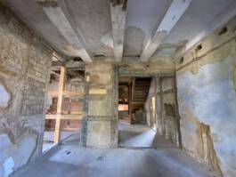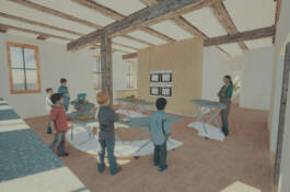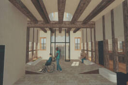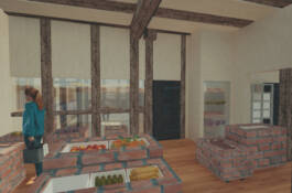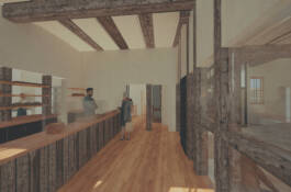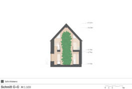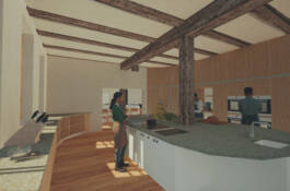 Durch das historische Eingangsportal, welches um einen Windfang ergänzt wird, erreicht man den großflächigen Korridor im Bestandsbau. An diesen schließt sich linkerhand die transparent produzierende Bäckerei mit Essbereich, sowie rechterhand der Verkauf lokaler Lebensmittel an. Hier werden vor Ort gewachsene Erzeugnisse verkauft, aber auch Hobbygärtner haben die Möglichkeit, ihre Übermengen ankaufen zu lassen.