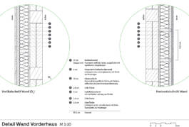 Eine Schattenfuge, die behutsam die Konturen des Bestands aufgreift, bildet den Übergang zur neuen Fassade. Diese besteht aus geköhlten Hölzern, welche reliefartig im Bestandsraster angebracht sind und das Fachwerk modern interpretieren. Die schwarze Fassade trägt außerdem dazu bei, dass sich der Neubau in der Wichtung gegenüber dem Vorderhaus zurück nimmt.