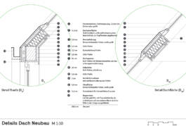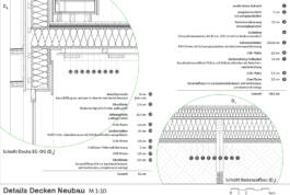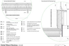 Das Gebäude ist im Sinne des zirkulären Bauens konzipiert. So ist es unter anderem auf Schraubfundamenten gegründet, mit nachwachsenden oder recycelten Materialien wie Zellulose oder Schaumglas gedämmt und konstruktiv komplett in Holzbauweise errichtet. Großflächige Glasflächen auf dem Dach lassen den Innenraum durch Sonnenlicht erwärmen, Photovoltaikelemente nutzen dieses zur Warmwasser- und Stromerzeugung, womit unter anderem eine Wärmepumpe betrieben wird. So versorgt sich der Gebäudekomplex fast autark und außschließlich mit erneuerbarer Energie. Um dabei die Effizienz hoch zu halten, werden alle Außenwände des Bestandsgebäudes um eine innen liegende Dämmschicht ergänzt.