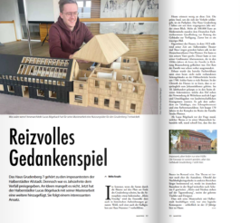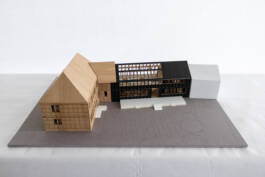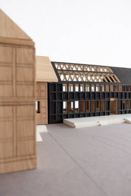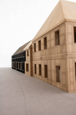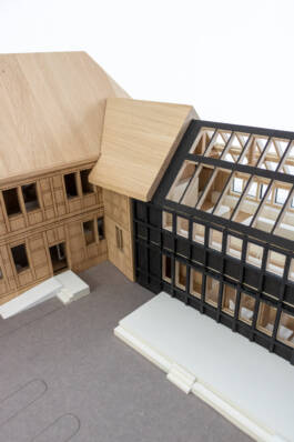 Dabei ist der Bestand in 12mm Eiche Vollholz mit originalgetreu geritzter Fachwerkfassade gefertigt, während der Neubau in 8mm Eichenfurnierplatte versucht, die Wirkung der schwarzen Fassade realitätsnah wiederzugeben. Die Innenwände sind in 6mm Eichenfurnierplatte gefertigt und möbelartige Einbauten sind einheitlich weiß lackiert. Alle Geschosse samt Dach sowie Alt- und Neubau sind nur an- und aufeinander gesteckt, sodass man diese jederzeit spontan ohne zusätzliches Werkzeug auseinander nehmen kann. Das Modell wird durch eine graue MDF-Platte gerahmt, welche gleichzeitig die Geländehöhen abstrahiert und die unmittelbare Umgebung geritzt darstellt.