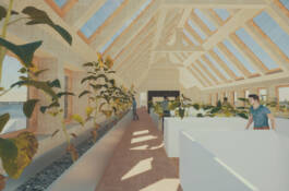 Unmittelbar damit verbunden ist das im Neubau befindliche Gewächshaus, welches sich fast über die gesamte Geschossfläche erstreckt und durch einen Deckendurchbruch optisch mit dem darunter liegenden Restaurant verbunden ist. Durch gleichbleibend warme Temperaturen können in den großflächigen Hochbeeten ganzjährig verschiedene Obst- und Gemüsesorten angebaut werden. Das Gewächshaus wird durch eine zugehörige Arbeitsküche mit Lager ergänzt. In diesem Bereich des Gebäudes befinden sich außerdem die sanitären Anlagen. Hier führt ebenfalls eine Treppe ins Dachgeschoss, welches einen Mitarbeiterraum beherbergt und einen einzigartigen Panoramablick über die Anbaufläche gewährt.