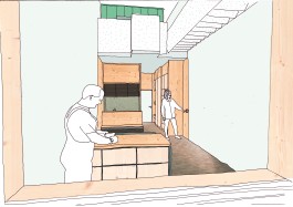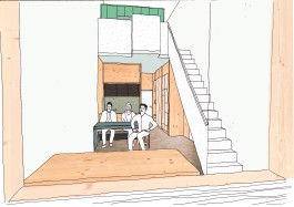 Die Grundfläche der Wohnateliers ist so zugeschnitten, dass jedes Start-up, egal ob Texter oder Handwerker, sie sich für seine Arbeit optimal nutzbar machen kann. Entsprechend ist die installierte Zone (Bad, Hauswirtschaftsbereich, Küche) kompakt im Zugangsbereich organisiert. Im Innenraum ermöglicht ein auf Schienen geführtes System mit Werkbank, Esstisch, Sitzbank und Küchenblock die Verkehrs- bzw. Aktionsfläche nach Belieben dem jeweiligen Workflow anzupassen. Von hier aus wird mit einer frei im Luftraum zu bewegenden Zugtreppe die Empore erschlossen auf der sich ein Schreibtisch und der Schlafbereich befindet. Durch ein großformatiges Fenster an der Westseite wird das ganze Raumvolumen großzügig mit Licht umspült.